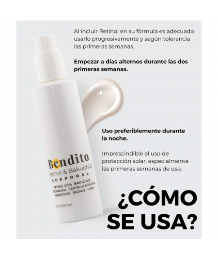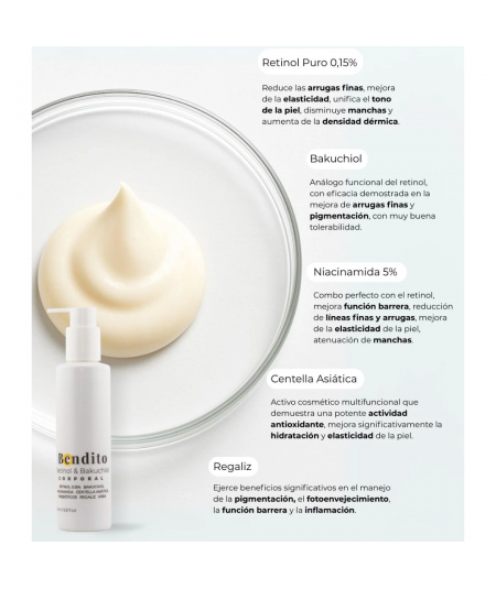 Con una textura ligera y de rápida absorción, esta crema está formulada con activos cosméticos con evidencia científica en sus acciones antiedad y de mejora del estado de la piel, combina Retinol (0.15%) y Bakuchiol, dos poderosos ingredientes con resultados comprobados en la mejora de la firmeza, suavidad, disminución de manchas y mejora de la luminosidad de la piel en todo el cuerpo.