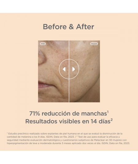 El uso de Melaclear ayuda a reducir rápida y significativamente la apariencia de todo tipo de manchas y es apto para todo tipo de piel.
