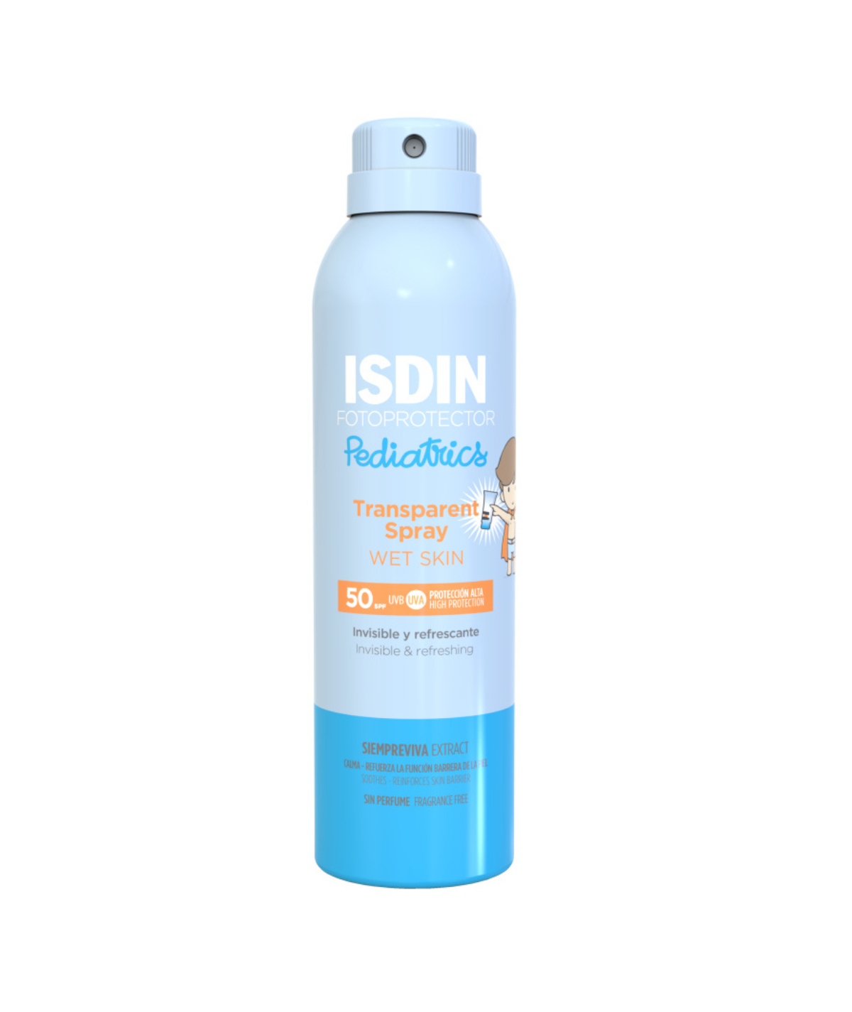Protege su piel con Transparent Spray Wet Skin Pediatrics, el fotoprotector corporal  transparente, fresco y de secado inmediato para niños y bebés a partir de 6 meses. Su fórmula contiene extracto de siempreviva, que ayuda a reforzar la barrera cutánea.