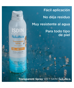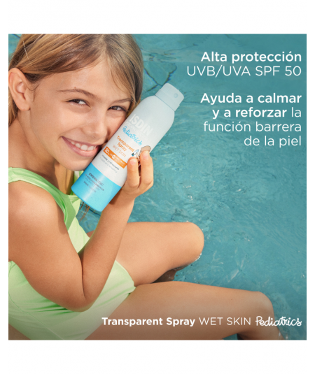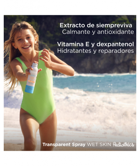 Las quemaduras solares durante la primera infancia se asocian con un mayor riesgo de cáncer de piel en la edad adulta. Transparent Spray Wet Skin Pediatrics está especialmente formulado para proteger la delicada piel del niño.
