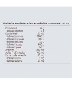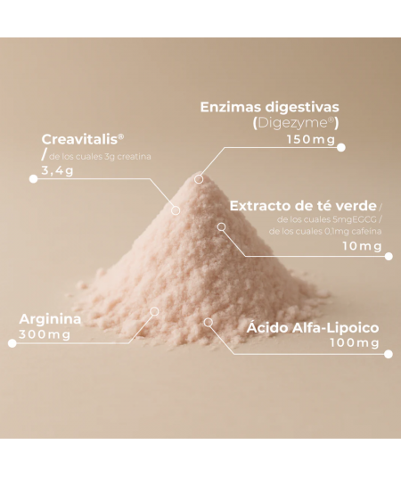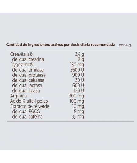 La creatina más completa.3 g de creatina netos de máxima pureza (Creavitalis®) con L-arginina, ácido alfa-lipoico, EGCG y enzimas digestivas para maximizar sus beneficios. Sin azúcares añadidos ni edulcorantes artificiales.