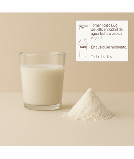 1 cazo (35g) disuelto en 250ml de agua, leche o bebida vegetal al día
