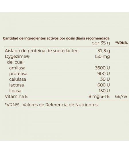 - Enzimas digestivas (Digezyme®): Complejo multienzimático patentado que facilita la digestión y mejora la absorción de proteínas, grasas y carbohidratos.
