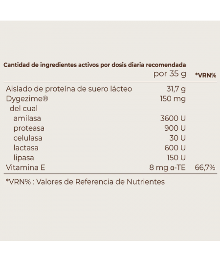 Aislado de proteína de suero lácteo (LECHE), cacao en polvo (Theobroma cacao), aroma natural de cacao, espesante (goma arábiga), complejo multienzimático [Dygezime® (amilasa, proteasa, celulasa, lactasa, lipasa)], sal, acetato de DL-alfa-tocoferilo (vitamina E).