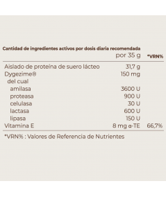 - Enzimas digestivas (Digezyme®): Complejo multienzimático patentado que facilita la digestión y mejora la absorción de proteínas, grasas y carbohidratos.